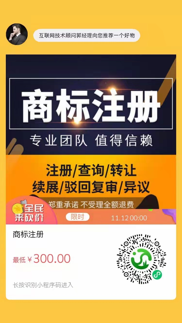 商戶要發(fā)展,品牌要打響。無(wú)論今年您的產(chǎn)品是否在雙十一電商大戰(zhàn)中擁有戰(zhàn)績(jī),現(xiàn)在樹(shù)立品牌意識(shí),重視商標(biāo)注冊(cè)等知識(shí)產(chǎn)權(quán)知識(shí)一定是發(fā)展之起點(diǎn)。抓緊參與森竹商城雙十一最后一天砍價(jià)活動(dòng),有機(jī)會(huì)獲得最低代理商標(biāo)注冊(cè)價(jià)格,愿大家都能早日實(shí)現(xiàn):我的品牌讓我做主。